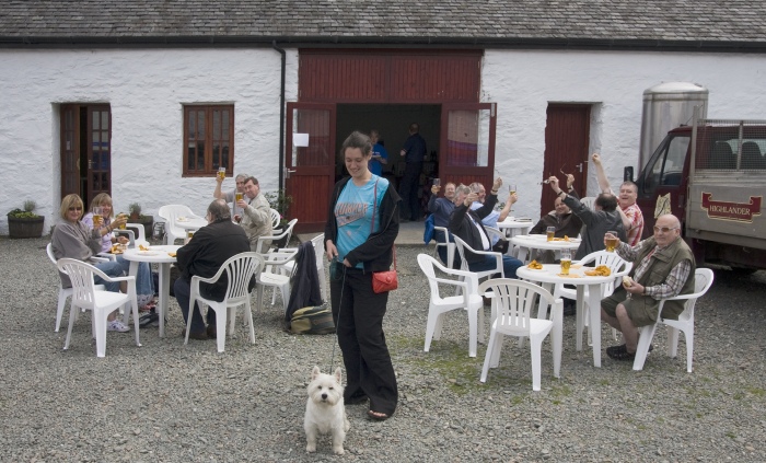 Seventeen members of Glasgow & West of Scotland CAMRA were blessed with a wonderful sunny day for their trip to Glen Fyne to present Jonny and Tuggy Delap of Fyne Ales Brewery with a Beer of the Year 2008 Award for their excellent pale quaffing beer Piper's Gold. Loch Fyne is well known as containing some of the purest water in Scotland and the brewery gets it before it reaches the loch, so maybe that is part of their secret. Of course, the recent addition to the staff of an ex Oakham brewer won't have done any harm either! Certainly everyone enjoyed sampling several Fyne Ales in perfect condition. Thanks must also go to Tuggy for supplying us with delicious buffet accompaniments. For those interested in nature, Jonny offered a lift further up the glen to meet their charming highland coos and see wild orchids, birds and other wildlife residing there. It was a perfect day out and Tuggy seemed especially pleased to receive and hold the trophy cup for a year.