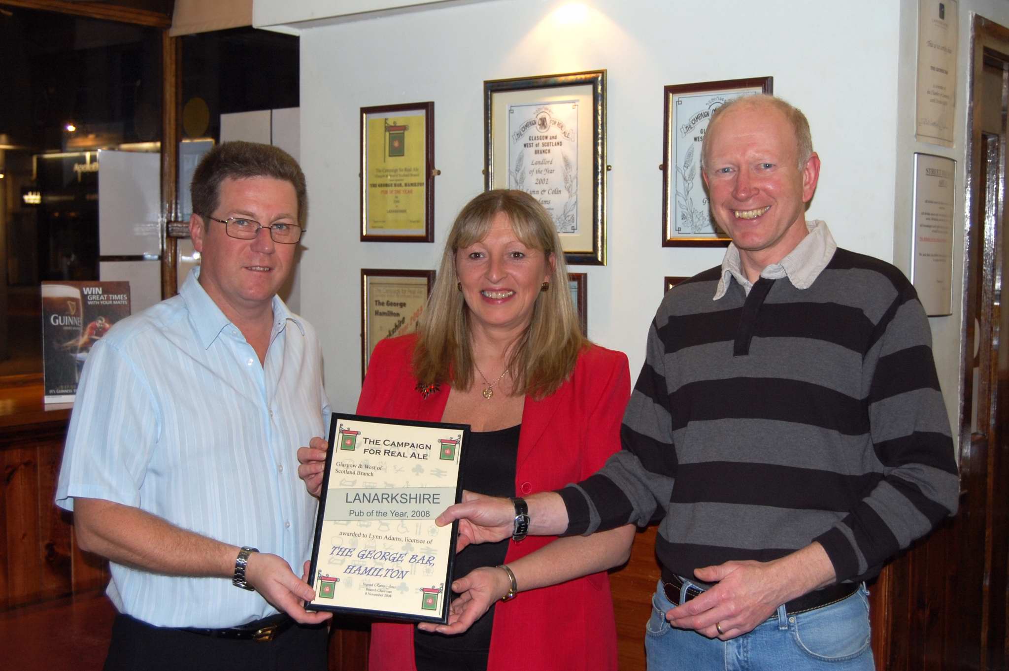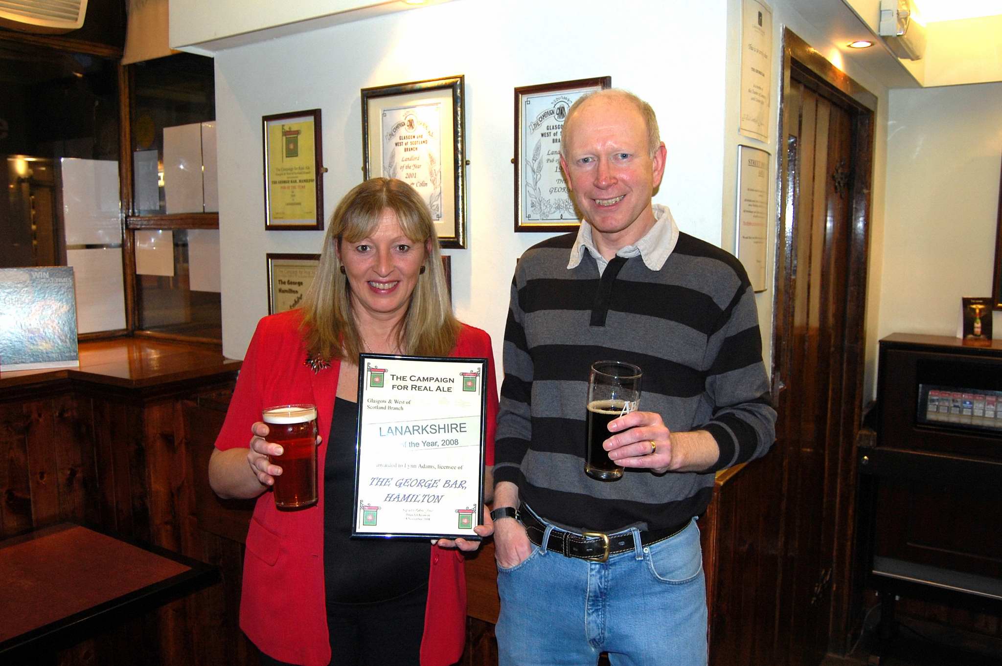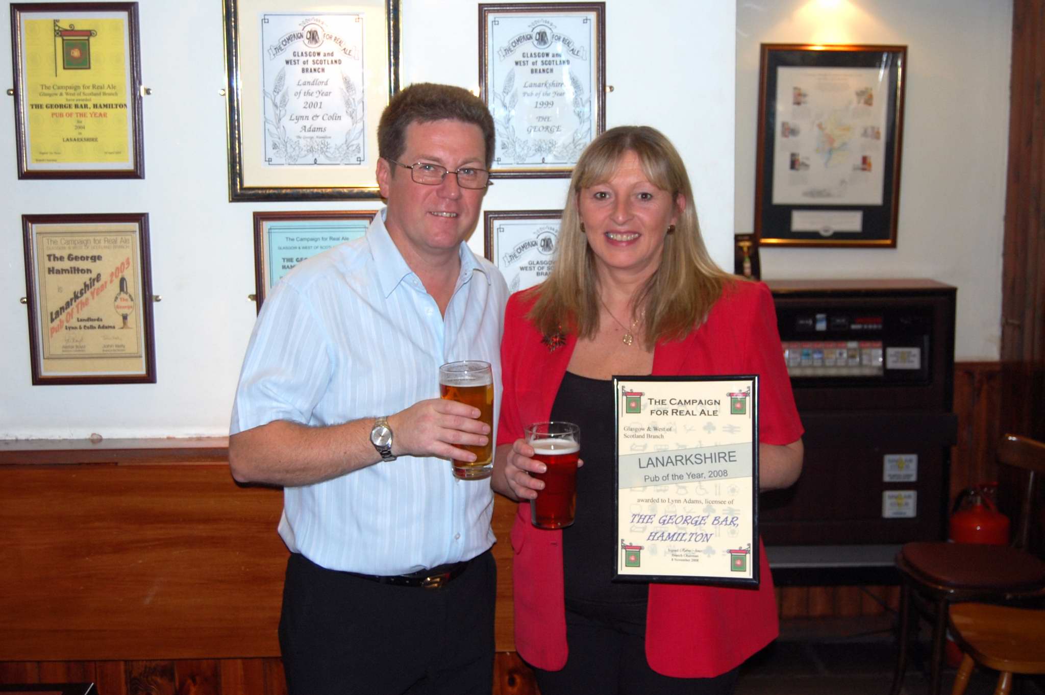 Tom Ord presented Lynn and Colin Adams with their award for becoming CAMRA's Lanarkshire Pub of the Year for 2008. In the background there are a selection of CAMRA awards from the past, testiment to the George's proud history of serving customers wtih real ales of high quality.
