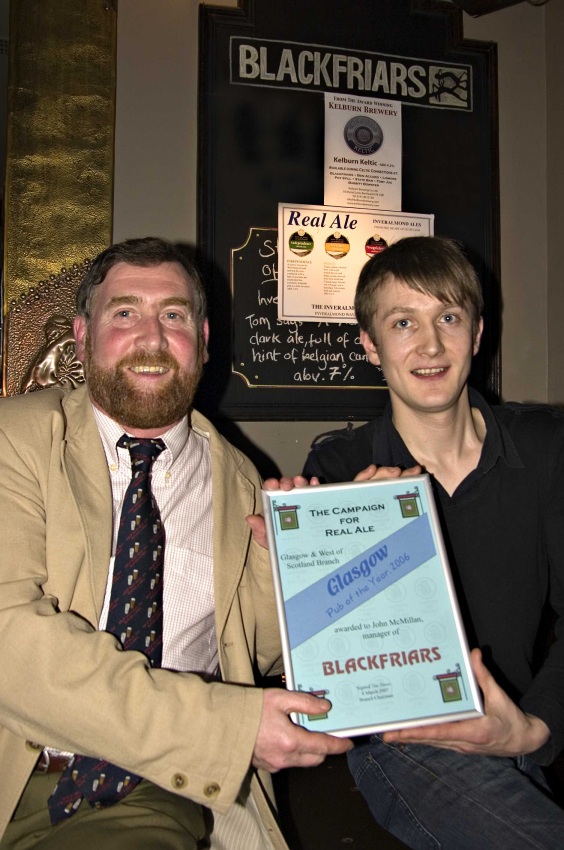 Thursday 8th March 2007 at Blackfriars, Glasgow was a night to remember for all those present. Located in the heart of the buzzing Merchant City (recent winner of a UK-wide Good Community award against over 100 communities) Blackfriars attracts a wide range of people from students to businessmen. The pub was already filling up around 7pm, when Jonny & Tuggy of Fyne Ales together with their two-man brewing team arrived for the Glasgow launch of their new premium beer Avalanche. This immediately began to slip down the throats of many eager to try it, including a group of German visitors who compared it favourably with the lager-style beers they are used to. Yet more proof that if you want beers with flavour, the way to get it is with a secondary fermentation in the cask. A process perfected in Britain's real ale style of brewing and dispense. And what perfection! Not only were the ales in spot on condition - which we have come to regard as the norm in Blackfriars - but the selection offered had something for everyone. Titanic Mild was there for those who enjoy the darker side of life, while Williams Red satisfied the richer palates and Directors offered a strong option. Lovers of the hop were spoiled with Dark Star Hophead and of course the aforementioned Avalanche well hopped with (wait for it) Cascade. Before long the band arrived and once the microphones were on line we were able to officially announce the release of Avalanche and make the Pub of the Year award to Blackfriars' manager John McMillan. Under John's leadership the pub has been refurbished to provide valuable extra space and disabled toilets and he has continued the tradition of providing a unique atmosphere and good beer, established under his predecessor Caroline. Due praise must also go to Tom who does the cellar work so well and the friendly bar staff. In fact Blackfriars has been such a good pub for so long, even we at Glasgow CAMRA can't understand why it hasn't won the award before. We are quick to complain when things are wrong, but it's so easy to take good service for granted. That Thursday, the pub's enviable track record was finally recognised.