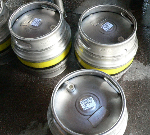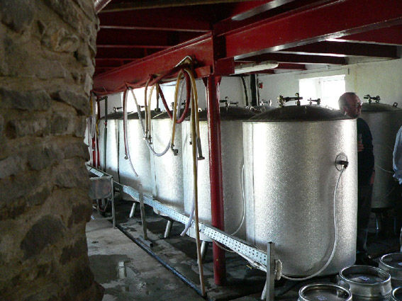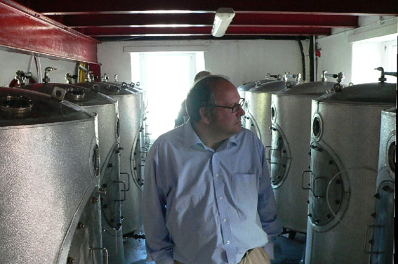 Inside the brewery. Tim Davies inspects the cooling tanks while the finished product awaits distribution.