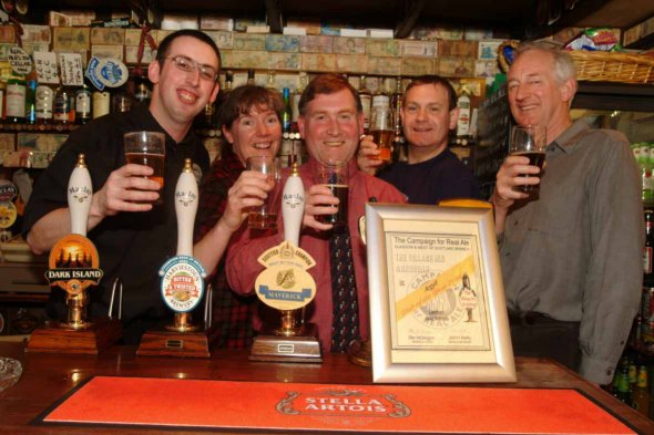 The second photo (courtesy of Helensburgh Advertiser) shows the presentation to the Village Inn, Arrochar, Dunbartonshire Pub of the Year for 2003. Pictured are Simon Bartran, Annabel Young, Robin Jones, Kenny Gillies and Richard Coates.